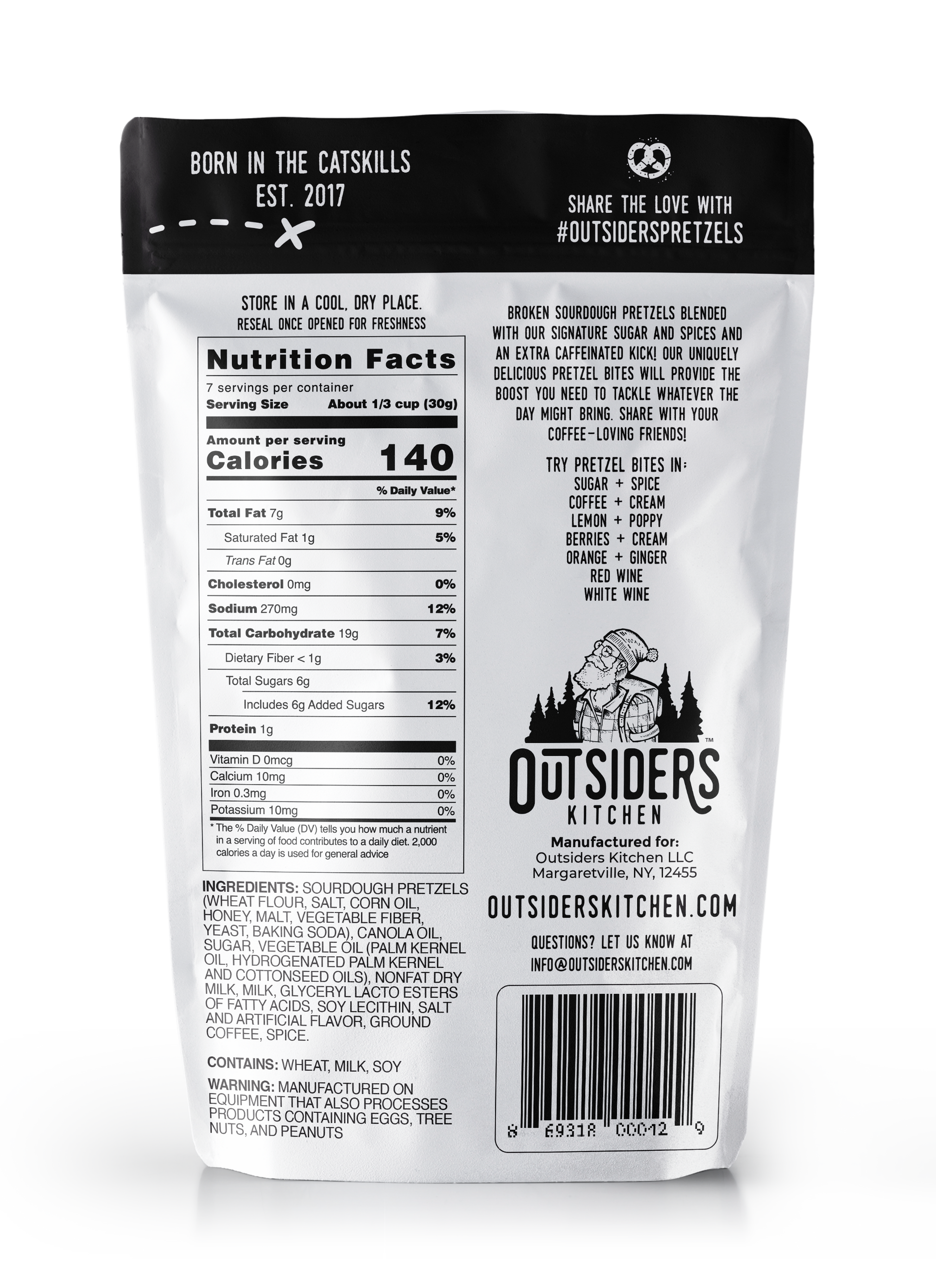 Need a delicious pick-me-up? Outsiders Kitchen Coffee + Cream Pretzel Bites are the ultimate sweet-and-salty snack for coffee lovers who crave bold flavor and satisfying crunch. We start with our signature sourdough pretzels, broken into bite-sized pieces, then infuse them with a rich blend of freshly ground whole bean coffee, smooth cream, and a subtle touch of cinnamon. The result? A perfectly balanced snack that’s energizing, indulgent, and impossible to resist. Whether you're powering through a busy day, unwinding with your favorite book, or just need a little treat between tasks, these bites deliver comfort and caffeine in every handful. Great for on-the-go snacking, midday boosts, or gifting to the coffee enthusiast in your life. They'll fuel your day, the delicious way!